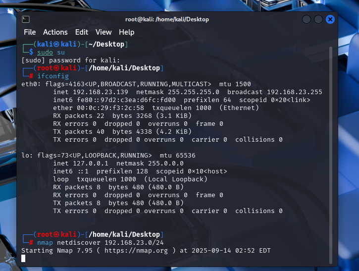 在Kali终端里,我们使用 netdiscover 工具进行网络扫描,寻找活跃的主机。