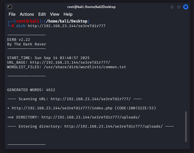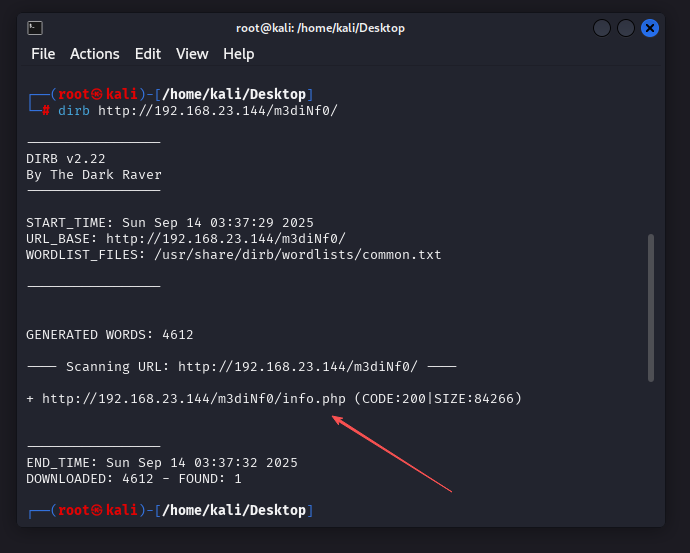 网站不可能只有一个页面,肯定有隐藏的目录和文件。我们需要一把“钥匙”来打开这些隐藏的门。这里我们使用 DIRB 工具(因为Kali自带了它,而Dirsearch需要手动安装)。