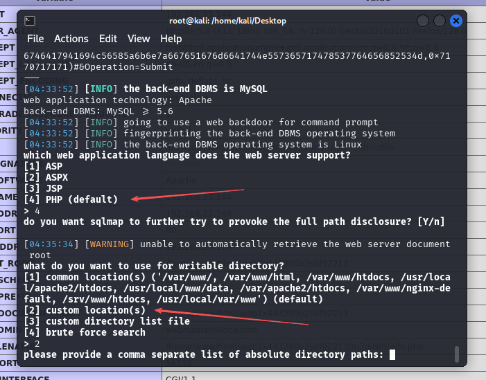 SQLMap会交互式地问我们一些问题。我们选择手动输入之前找到的绝对路径下的 uploads 目录(因为这个目录通常有写权限)。