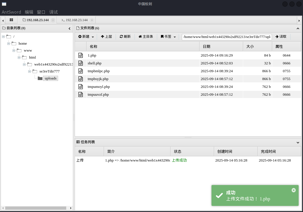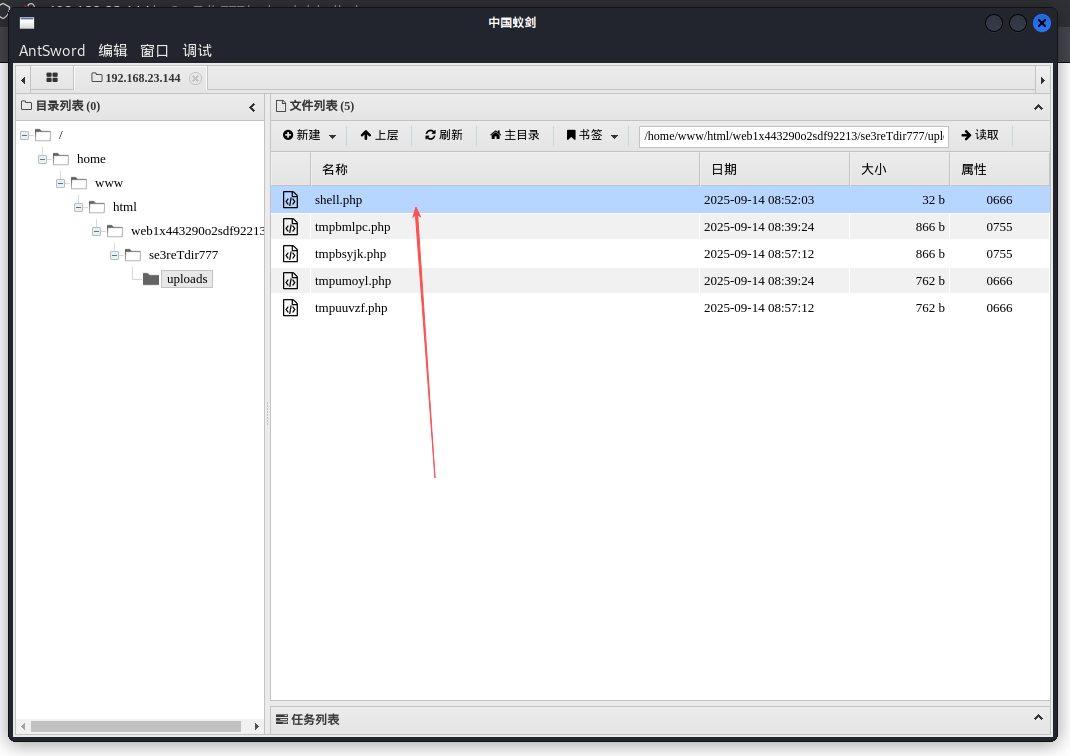 成功了! 我们拿到了一个 WebShell!这意味着我们在服务器内部安插了一个“内应”,可以通过它执行系统命令了。